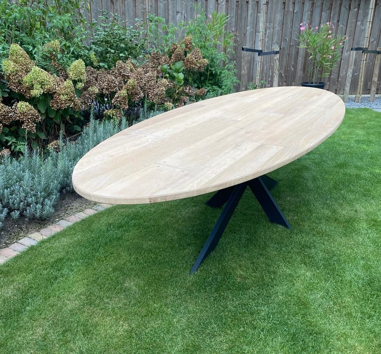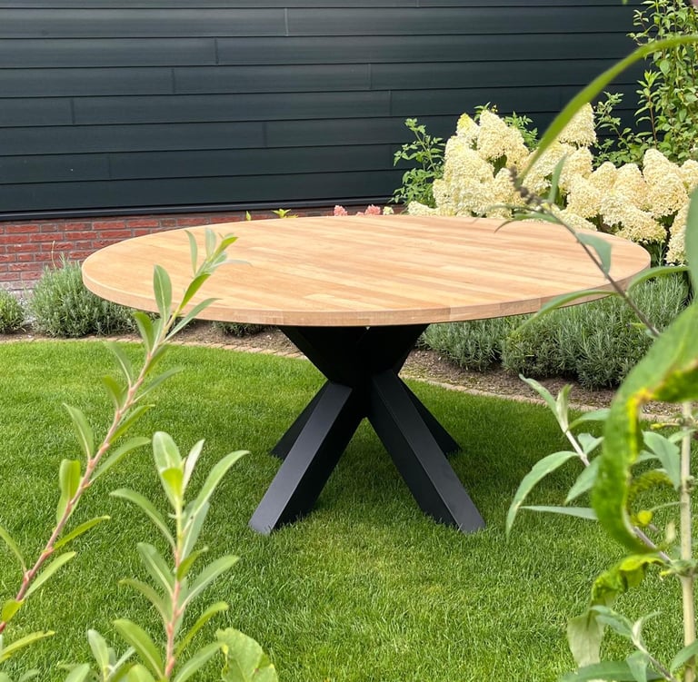 Deze robuuste ovale tafel is gemaakt uit gerecycled eiken hout, de vorige tafel was rechthoekige met houten poten. Op verzoek hebben wij deze tafel ovaal gemaakt en voorzien van een zwart stalen matrix poot. Zo kan mijn weinig nieuwe middelen toch een totaal nieuw model ontstaan.
